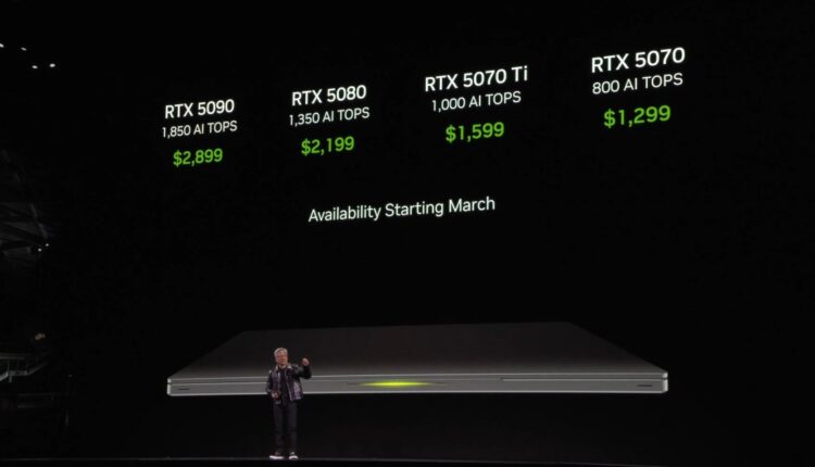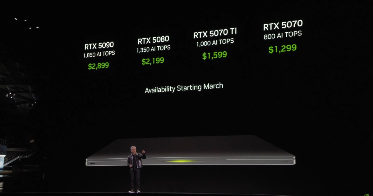 Le RTX 5080 sera disponible sur les ordinateurs portables en mars, aux côtés des RTX 5090, RTX 5070 Ti et RTX 5070. Le GPU contiendra 7 680 cœurs CUDA, avec une plage de TGP de 80-150W (+25W de réserve), et 16 Go de VRAM GDDR7, similaire à son homologue de bureau. Selon NVIDIA, attendez-vous à ce que les ordinateurs portables équipés d’un RTX 5080 soient lancés à un prix de départ de 2 199 €.