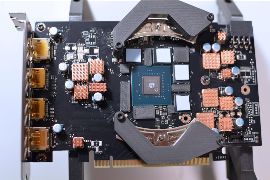 Sans aucun doute, la version la plus « difficile » de cette configuration est la carte graphique, car pour la refroidir passivement avec ce dissipateur Noctua NH-P1, nous devons enlever le dissipateur d’origine et fixer le nouveau de la manière la plus sécurisée possible. Le redditor a conçu en 3D une sorte de plaque arrière pour supporter le dissipateur, de sorte que le GPU soit libéré de tout ce poids.