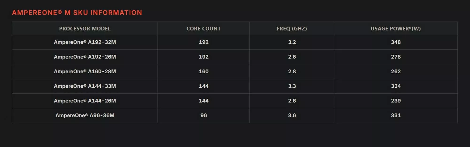 Le modèle phare AmpereOne A192-32M propose 192 cœurs tournant à 3,2 GHz avec un TDP de 346W. Le reste de la gamme se décline comme suit :