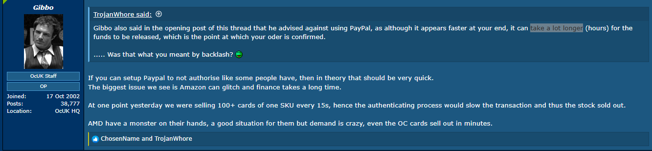 Un autre point notable évoqué par le personnel d’OcUK concerne le mode de paiement. Il est conseillé aux clients de choisir un moyen de paiement autre que PayPal, ce qui pourrait permettre un processus d’enregistrement plus rapide de leur achat. Cela pourrait faciliter l’obtention de leur carte graphique dans un contexte de haute demande.