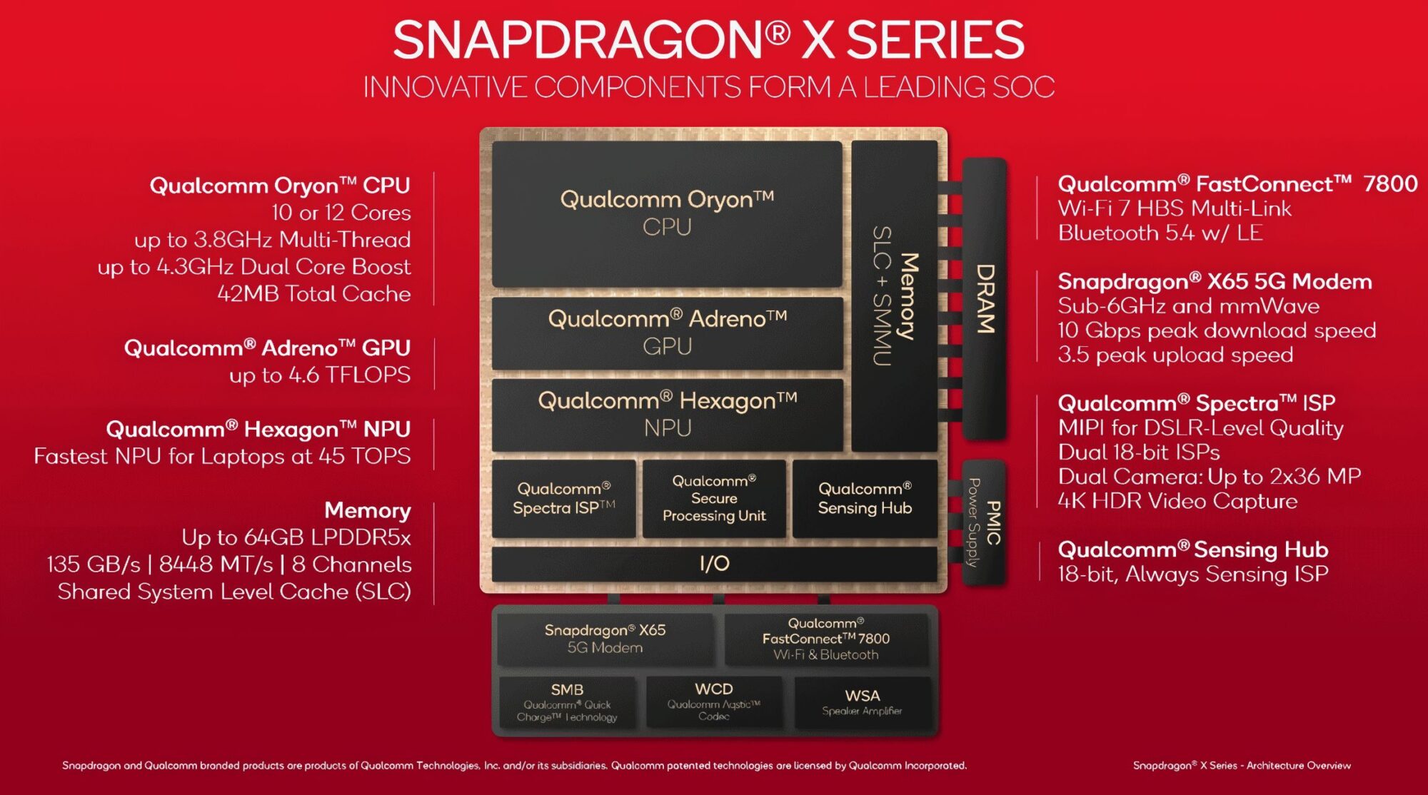 Le processeur Qualcomm Snapdragon X (System on a Chip) est construit avec un processus de 4 nm et comprend un total de 12 cœurs de CPU Oryon. Il peut atteindre jusqu’à 4,3 GHz avec la déclinaison la plus rapide disponible. Plus important encore, il est livré avec des graphiques Adreno intégrés et une unité de traitement neuronal (NPU).