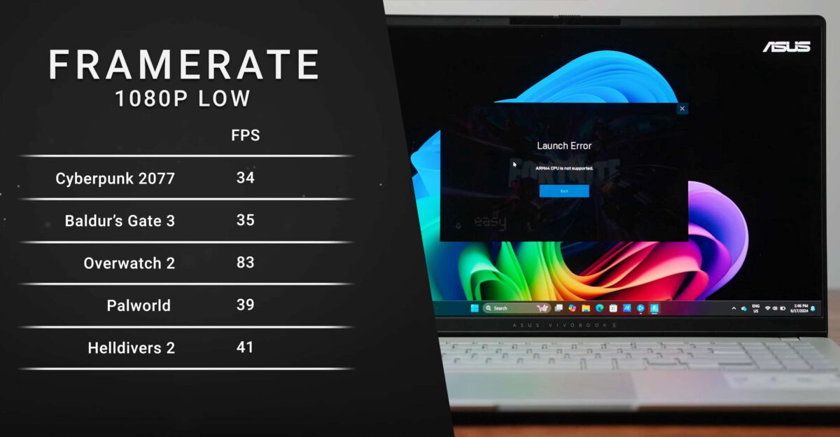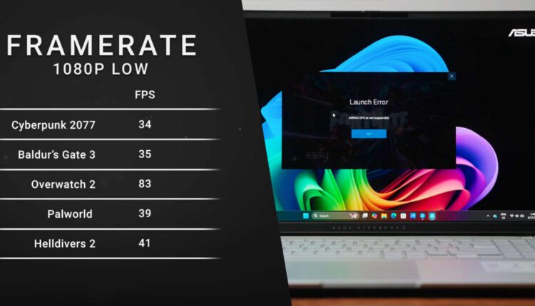 Outre les erreurs d’émulation ARM anticipées (certains jeux ne démarrent même pas), certains jeux n’autorisent pas les utilisateurs à changer la résolution pour correspondre à l’écran, ou affichent des taux de rafraîchissement inférieurs à ceux attendus, même lorsque le suréchantillonnage est utilisé. Il est clair que le Snapdragon X n’est pas conçu pour les joueurs, ce qui explique pourquoi Qualcomm n’était pas très désireux de discuter du jeu autant qu’on aurait pu l’espérer plus tôt.
