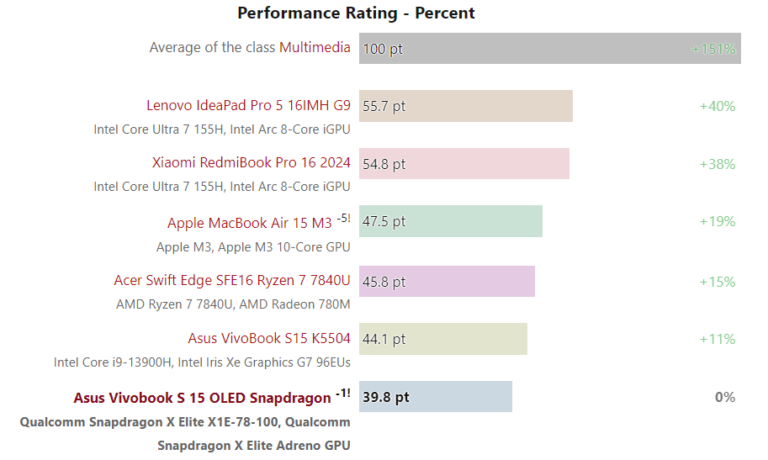 En termes de graphiques, le processeur semble être au mieux un milieu de gamme. L’accent est mis sur l’unité NPU, actuellement la plus rapide du marché (45 billions d’opérations par seconde). Cependant, il sera bientôt en concurrence avec AMD Strix Point et Intel Lunar Lake, qui sont tout aussi rapides, voire plus rapides que la puce de Qualcomm.