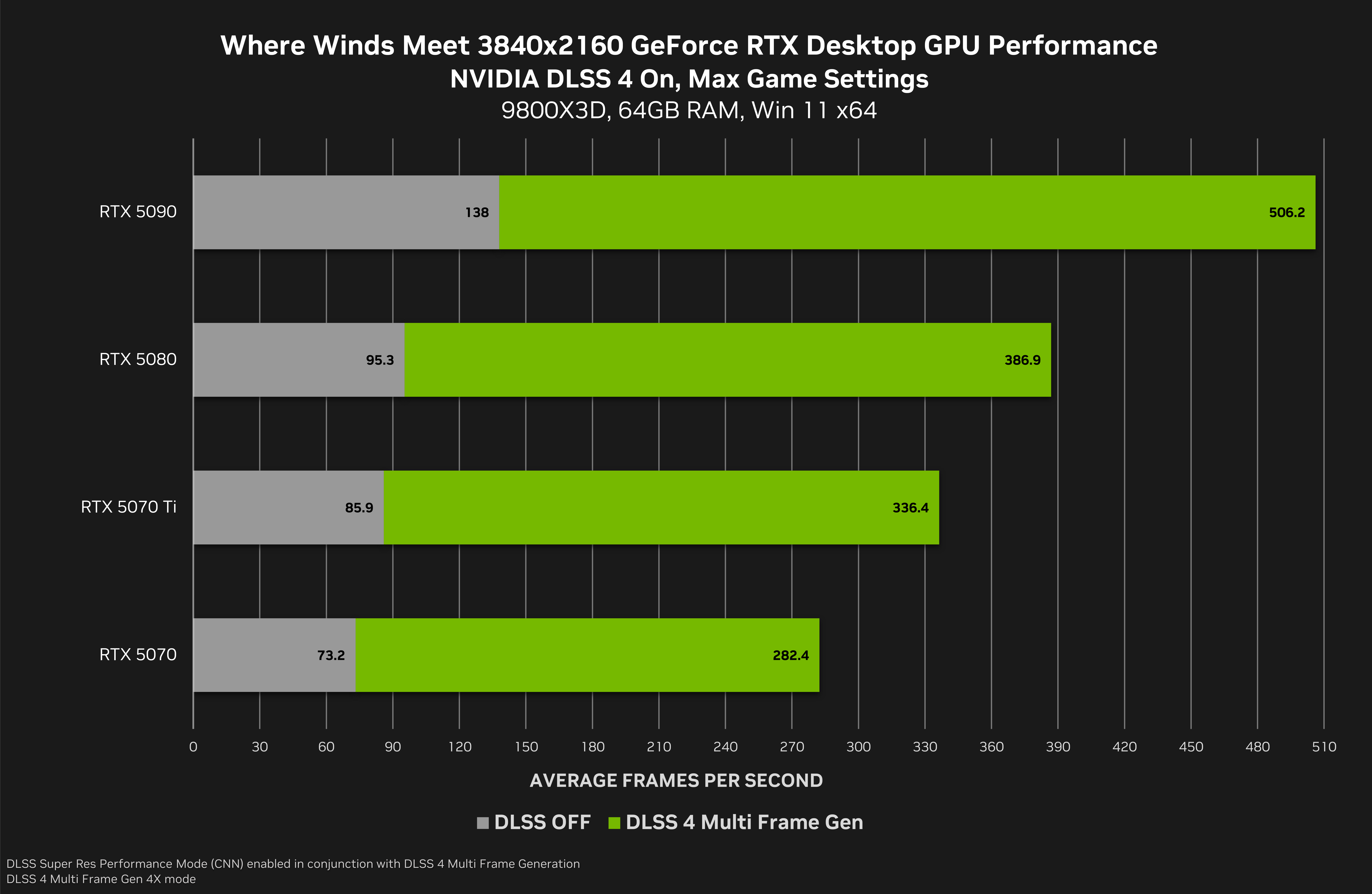 Where Winds Meet, un jeu RPG d’action monde ouvert, a aussi reçu une mise à jour pour supporter la génération d’images DLSS 4, en plus des fonctionnalités Frame Generation et Super Resolution. Selon NVIDIA, les performances peuvent être multipliées par 3,9 en 4K avec les réglages max. Le RTX 5090 permet de dépasser les 500 images par seconde. Une phase de bêta fermée est prévue prochainement.