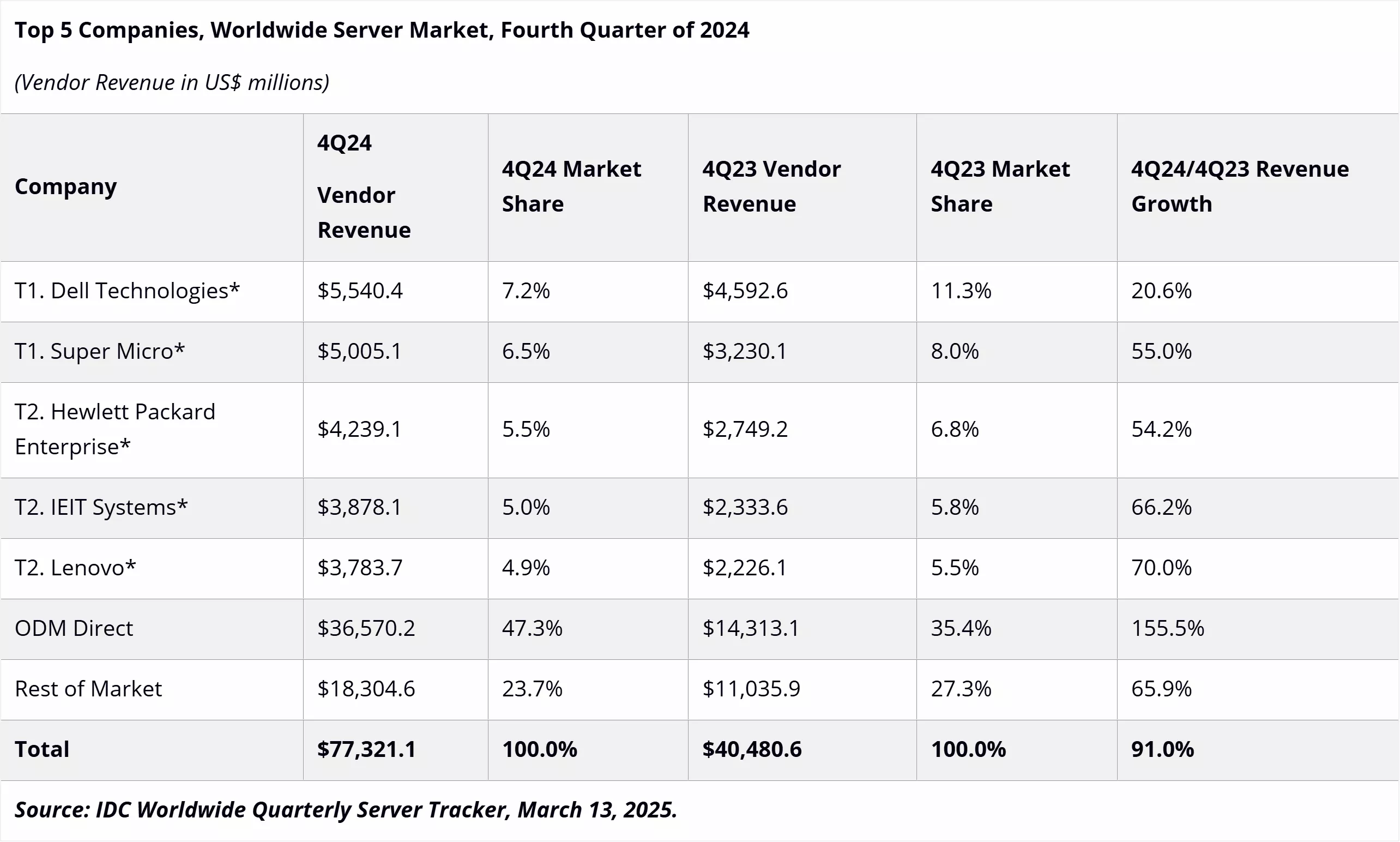 Les cinq principaux fournisseurs de serveurs ont vu leurs revenus croître presque à l’inverse de leurs classements. Lenovo, en cinquième position, a connu la plus forte croissance – 70%. IEIT Systems a enregistré une augmentation de 66,2% de ses revenus, tandis que HP et Super Micro ont cru d’environ 55%. Dell a vu sa part de marché diminuer de 11,3% à 7,2% avec seulement 20,6% de croissance des revenus, mais a conservé sa première position.