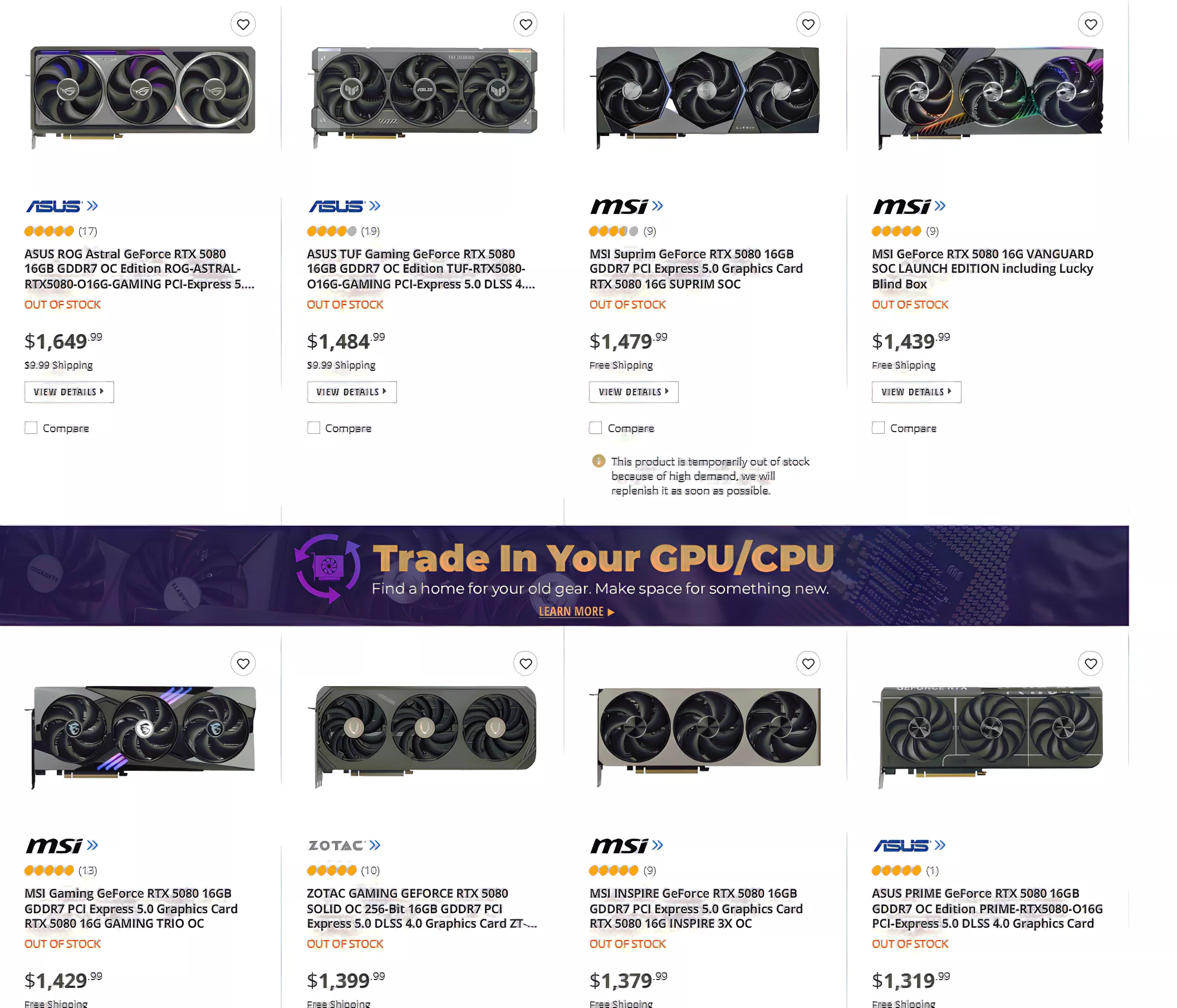 Certains partenaires constructeurs de carte facturent plusieurs centaines d’euros de plus que le prix conseillé par NVIDIA de 999€ pour leurs cartes RTX 5080. Seuls les modèles FE sont au prix sur Best Buy, qui liste également un Asus ROG Astral RTX 5080 à 1,649€.