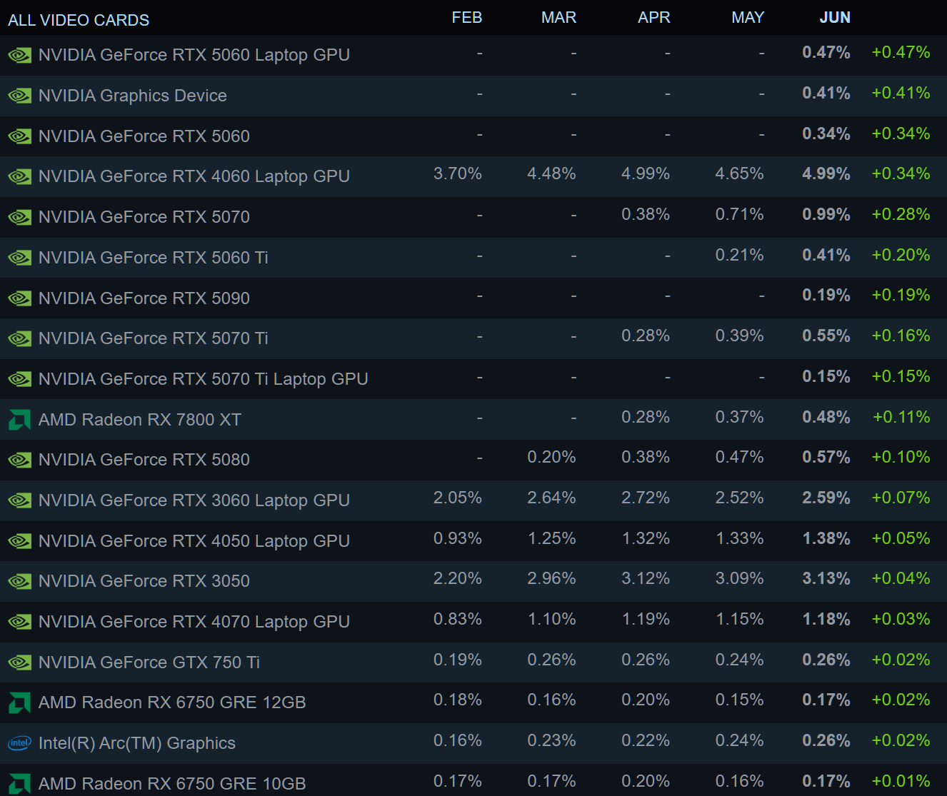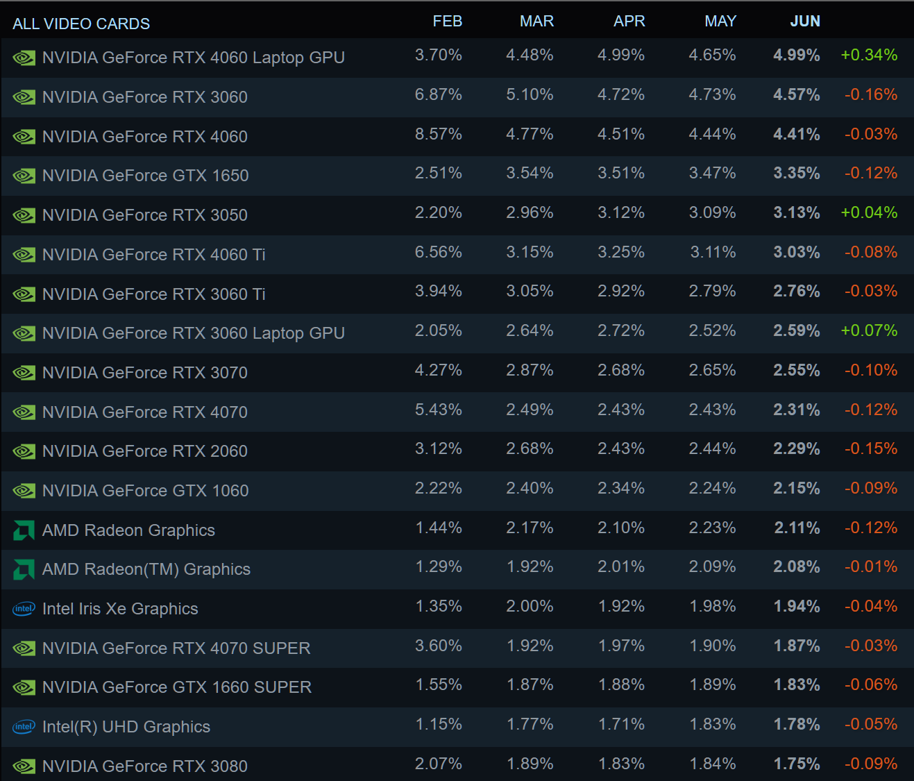 Les résultats les plus récents du sondage Steam, publiés avec un jour de retard, indiquent que le GPU RTX 4060 pour ordinateurs portables a une fois de plus conquis la première place parmi les participants en juin. Après avoir été en tête en avril, il avait cédé à la RTX 3060 le mois suivant. Maintenant, cette puce mobile est de retour en tête.