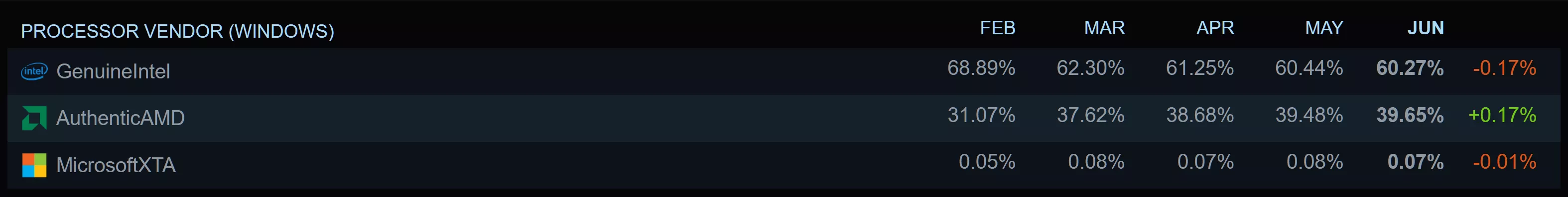 Concernant la section des processeurs, AMD poursuit sa tendance de longue date à gagner des parts de marché tandis qu’Intel diminue. Les processeurs de l’équipe Rouge sont désormais présents dans 39,56% des PC des participants, tandis que les processeurs de l’équipe Bleue sont tombés à 60,27%. Il ne faudra probablement pas longtemps avant que les CPU d’AMD ne soient présents dans quatre des dix appareils, ce qui semblait impossible il y a quelques années.