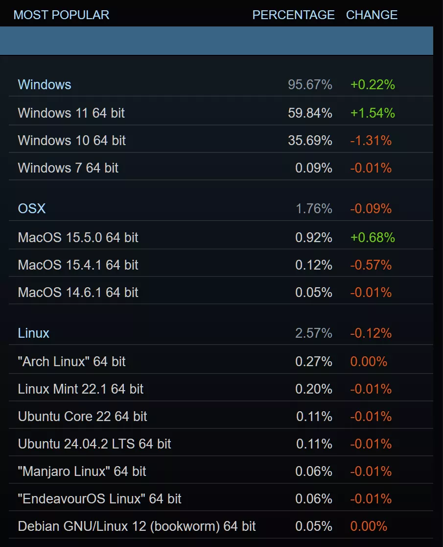 Par ailleurs, Windows 11 est désormais de loin le système d’exploitation le plus utilisé. Il est à quelques points de pourcentage d’atteindre une part de 60%, tandis que Windows 10 a de nouveau chuté, tombant à 35,6%. Avec la date de fin de support de l’ancienne version (14 octobre) qui approche dans un peu plus de trois mois, attendez-vous à ce que son taux de déclin augmente.