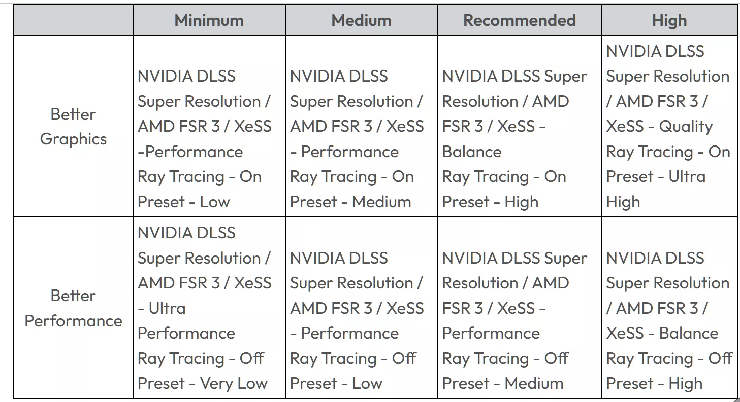 Une RTX 3060 pour le niveau Medium ne semble pas trop mal. Même une RTX 3070 pour le niveau Recommandé est convenable, compte tenu que c’est le réglage « optimisé » pour les écrans 4K – et la RTX 4060 est désormais la carte la plus populaire parmi les participants au sondage Steam.