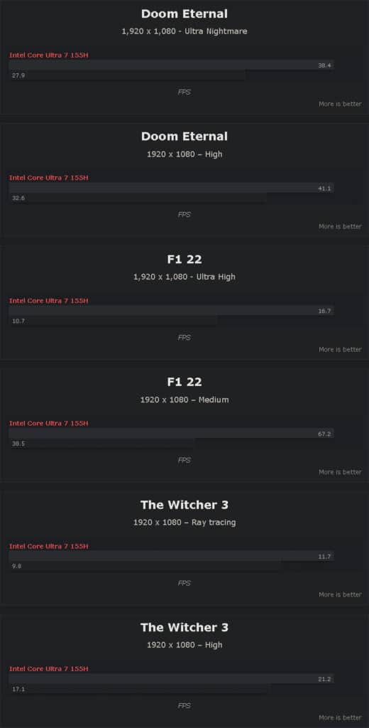 « … en ce qui concerne la jouabilité dans les vrais jeux, vous devez encore réduire la résolution ou le niveau de détail. Si vous passez de l’ultra-élevé à moyen à F1 22 avec une résolution de 1920 x 1080 pixels, vous pouvez presque tripler le rendu de l’image et atteindre bien plus de 60 images par seconde. Avec The Witcher 3, les performances peuvent être presque doublées, mais Doom n’augmente que légèrement », mentionne le site.