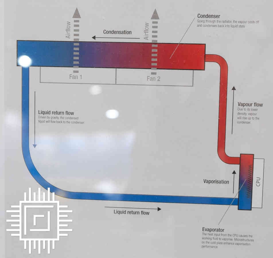 Pour ceux qui ne le savent pas, le Thermosiphon est une méthode d’échange de chaleur passive, basée sur la convection naturelle de la chaleur, qui fait circuler un fluide sans nécessiter de pompe mécanique. Cela lui confère un énorme avantage en termes de fiabilité car aucune version mobile n’est nécessaire pour son fonctionnement. Alors que dans le cas du prototype de Noctua, la marque utilise des ventilateurs pour transférer la chaleur du radiateur à l’environnement, rien n’empêche Noctua de proposer une version sans ventilateur. Supposant que le radiateur soit suffisamment grand pour transférer passivement la chaleur ou que la charge thermique soit suffisamment faible pour être gérée.