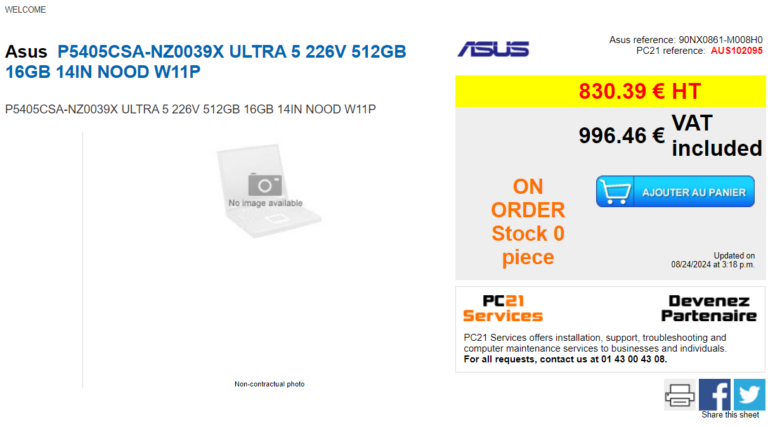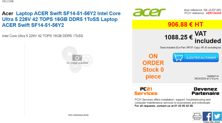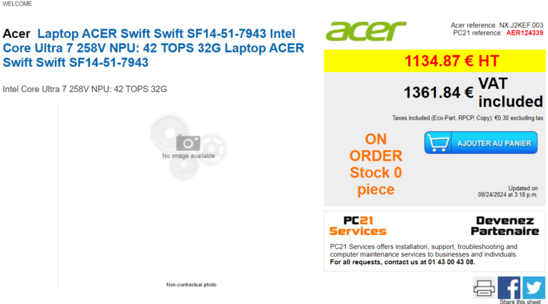 En France, plusieurs annonces pour l’Acer Swift SF14-51 et l’ASUS ExpertBook P5405, équipés des modèles Intel Core Ultra 5 ou Ultra 7, ont été recensées. Les prix pourraient être les suivants :