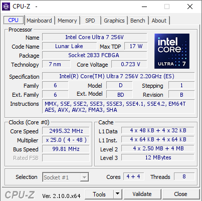 | Core Ultra 7 256V | 17W | 30W | 12MB | 16GB(1R) | 4.8 GHz | 3.7 GHz | Arc 140V | 1.95 GHz | 47 | 64 | ||||||