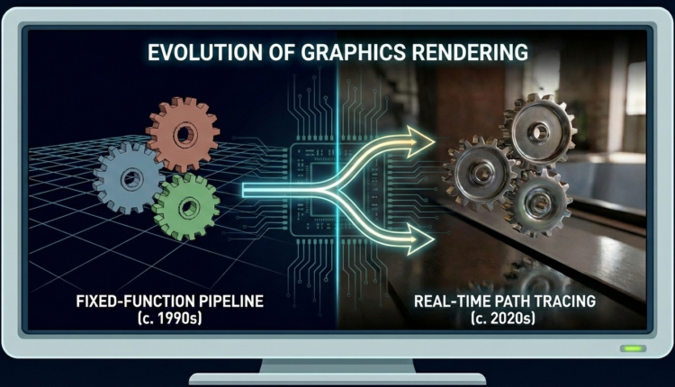 Nous allons retracer l’évolution du pipeline de rendu graphique sur PC, depuis l’ère des fonctions fixes jusqu’à celle du ray tracing en temps réel, en via le développement des shaders programmables. Cette analyse vise à éclairer les enjeux actuels et futurs du graphisme sur PC.