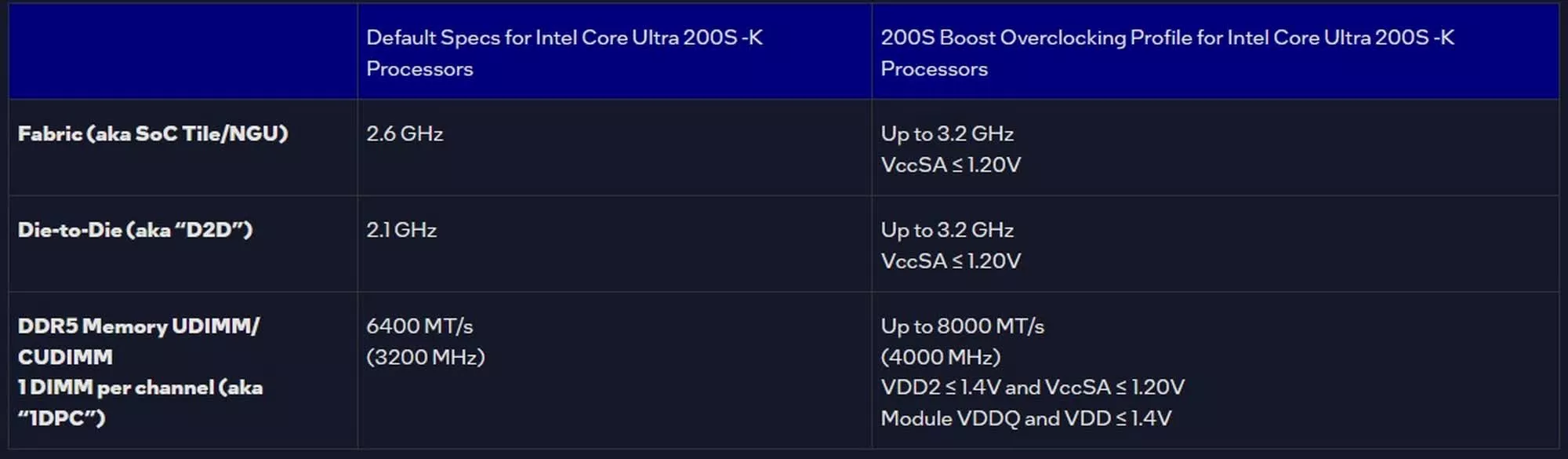 Le 200S Boost permettra aux utilisateurs d’atteindre des fréquences de fabric, de die-to-die et de mémoire plus élevées, engendrant des gains de performance pour des charges de travail à faible latence comme le jeu. Intel affirme que la fonctionnalité peut augmenter les fréquences de fabric inter-die sur les processeurs de la série 200S de 2,6 GHz à 3,2 GHz (VccSA ≤ 1,2V) et les fréquences de die-to-die de 2,1 GHz à 3,2 GHz (VccSA ≤ 1,20V). Elle peut également aider à overclocker la mémoire DDR5 de 6,400 MT/s à 8,000 MT/s.