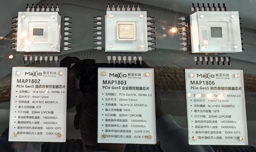 Pour le marché des SSD PCIe 5.0, Maxio a dévoilé trois nouveaux contrôleurs qui ciblent des segments spécifiques du marché. Tout d’abord, le MAP1802 vise les charges de travail grand public, sa petite taille de 9 mm x 13 mm en fait un choix parfait pour les SSD M.2 NVMe. Ensuite, il y a le MAP1803, qui cible le marché des SSD d’entreprise avec une prise en chage allant jusqu’à 64 To de mémoire NAND. Enfin, le MAP1806 offre des caractéristiques intermédiaires entre le MAP1802 et le MAP1803.