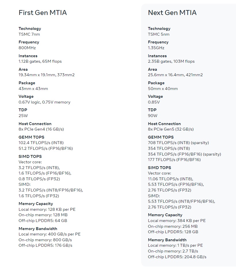 Vous pouvez voir ci-dessous les caractéristiques des puces MTIA v1 et v2 de META. META a obtenu d’énormes gains de performances avec ses dernières puces, malgré une légère augmentation de la surface en silicium.