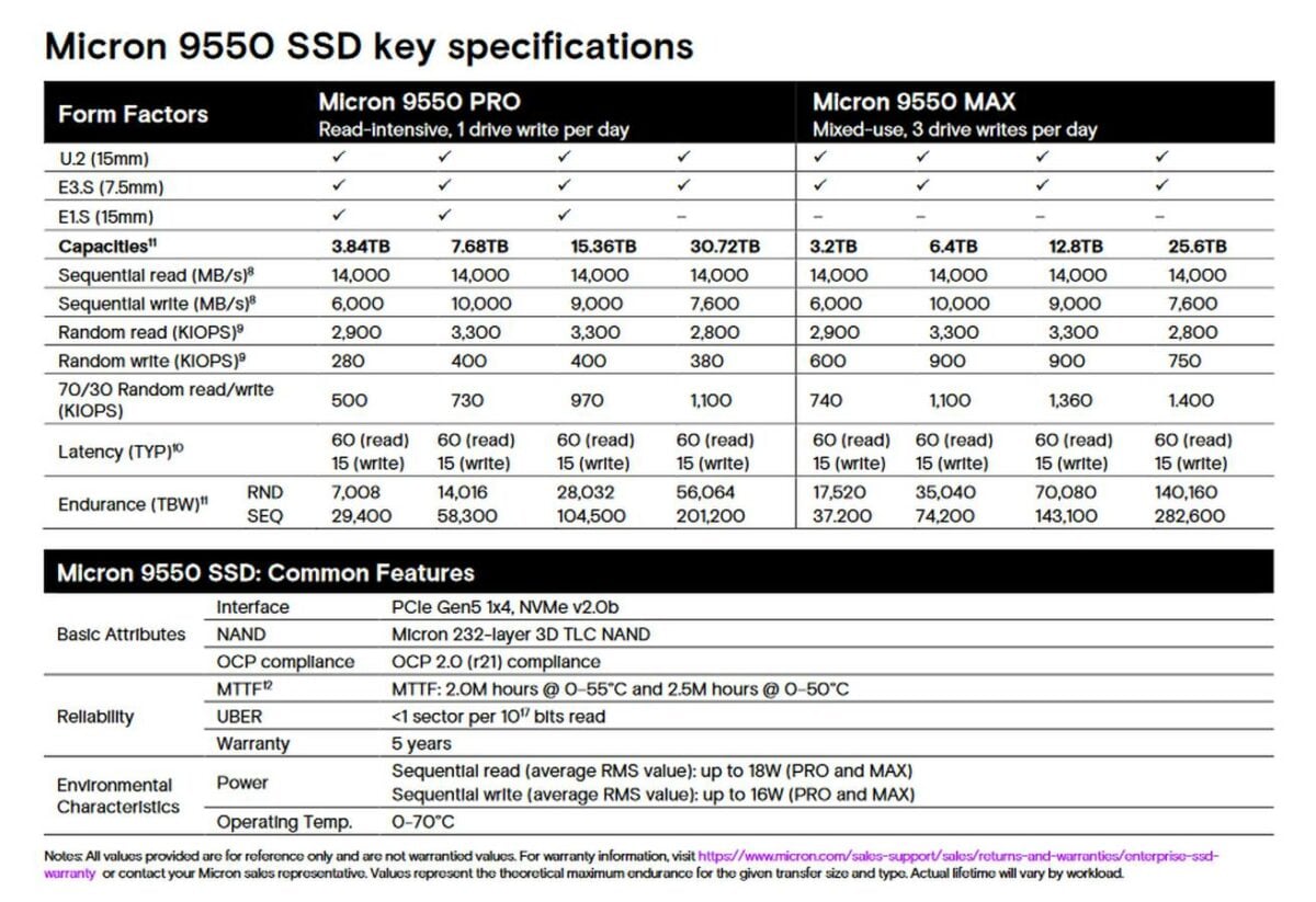 En parlant de durabilité, Micron annonce jusqu’à 56 064 To de TBW (Terabytes Écrits) pour les écritures aléatoires et 201 200 To de TBW pour les écritures séquentielles sur le plus grand modèle Pro, tandis que le Max pousse les limites beaucoup plus loin avec jusqu’à 140 160 To de TBW pour les écritures aléatoires et 282 600 To de TBW pour les écritures séquentielles. Plus de détails peuvent être trouvés dans le tableau ci-dessous.