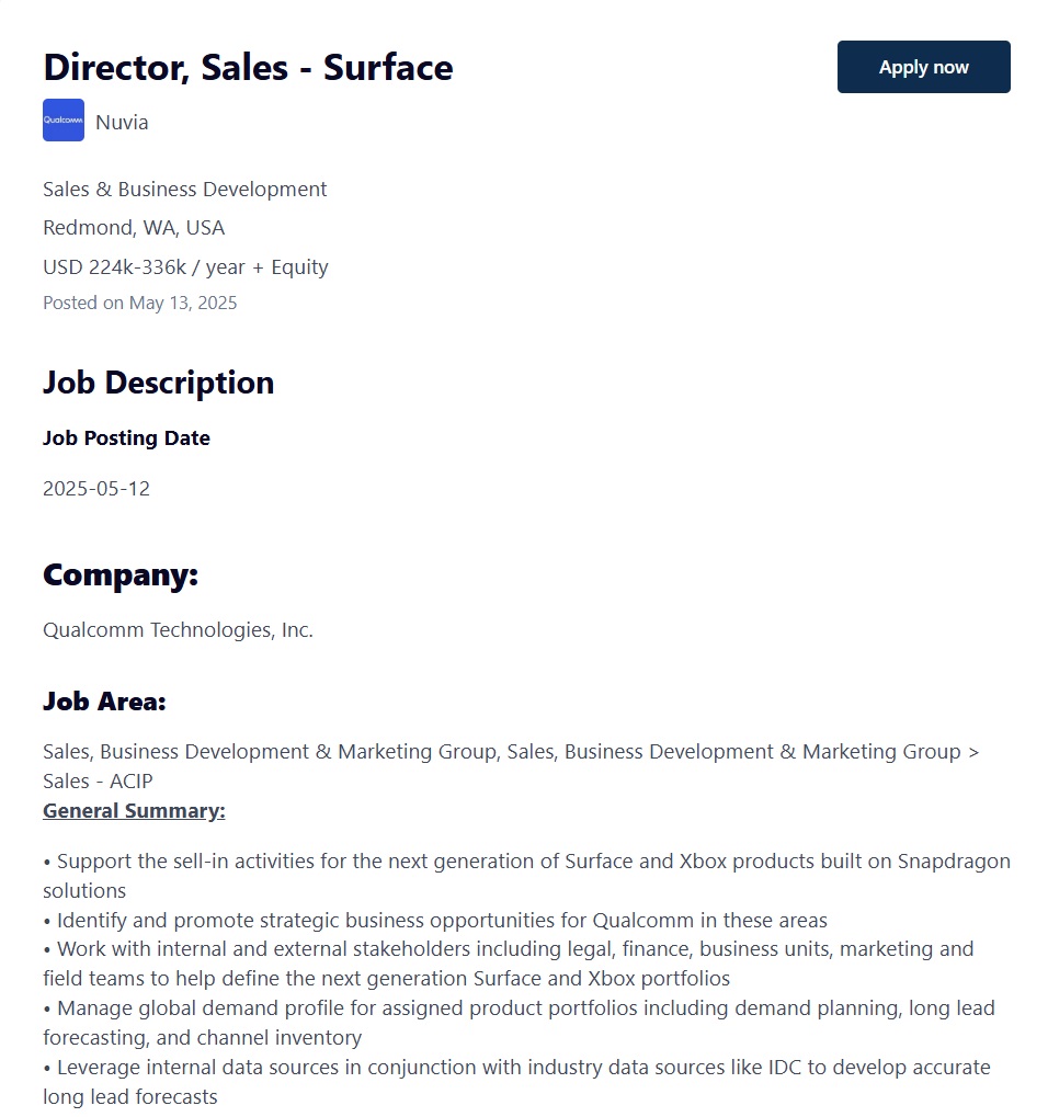 D’après un message sur les forums ResetERA, une annonce de Qualcomm pour un directeur des ventes mentionne que le poste soutiendra les « activités de vente pour la prochaine génération de produits Surface et Xbox construits sur des solutions Snapdragon ». Cela laisse entendre que la plateforme ARM/Snapdragon pourrait propulser certaines offres de Microsoft. Sa grande efficacité énergétique laisse penser que le futur appareil portable Xbox en bénéficiera, bien que cela pourrait poser des problèmes de compatibilité avec les jeux x86 actuels.