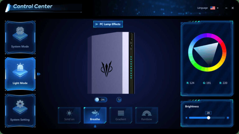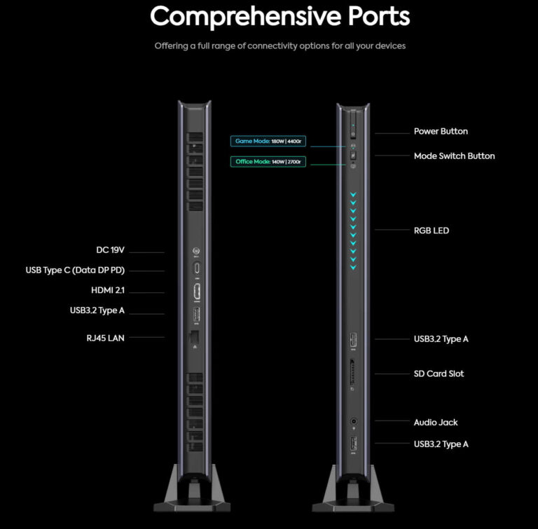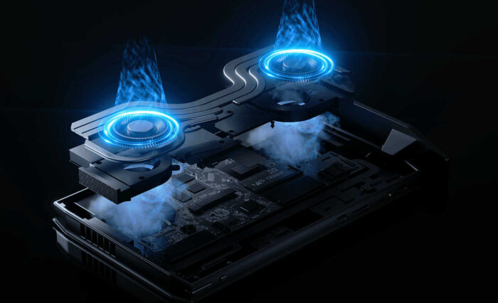 Concernant les performances, le PC prend en charge deux modes : le ‘Mode de Travail’ à 140W (puissance combinée CPU/GPU) avec un ventilateur à 2700 RPM, et le ‘Mode Performance’ à 180W, avec une double ventilation tournant à 4400 RPM. L’entreprise annonce que le CPU peut atteindre 90W (en burst sur un seul cœur) et que le GPU est configuré à 140W.