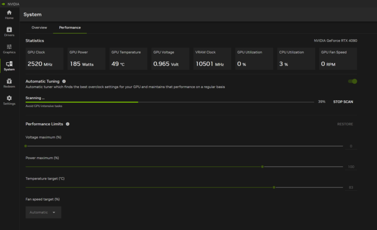 NVIDIA affirme que, une fois activée, la fonction d’auto-tuning effectuera des analyses régulières pour assurer des performances optimales du GPU. Les tests complets peuvent prendre de 10 à 20 minutes, en fonction des paramètres. NVIDIA recommande de laisser le système sans surveillance pour obtenir les meilleurs résultats.