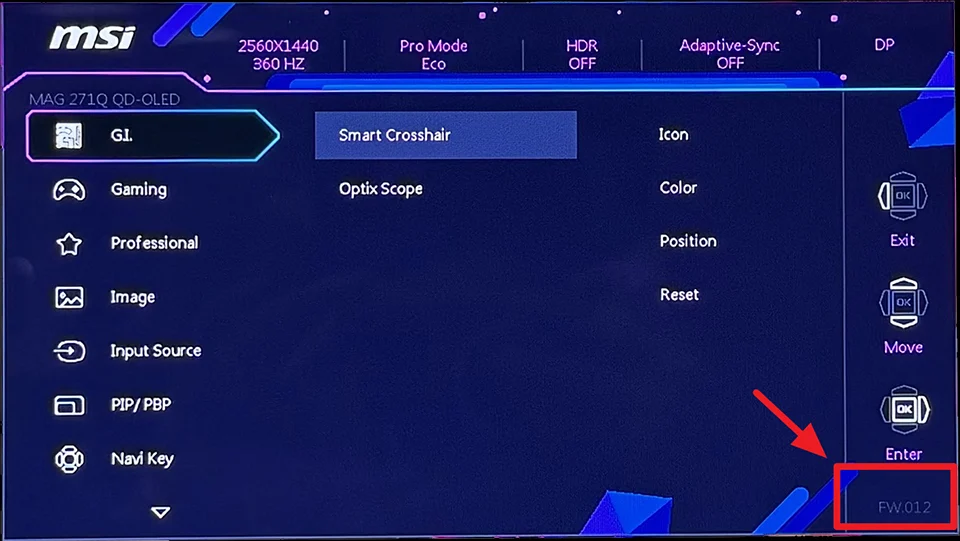 Pour vérifier votre firmware, accédez à l’OSD (affichage à l’écran) et regardez dans le coin inférieur droit. FW.011 ou une version antérieure sur MAG 271QPX et FW.014 ou une version antérieure sur MAG 321UPX indique que vous devez demander de l’aide à MSI. Si vous utilisez respectivement FW.012 et FW.015, vous êtes déjà à jour. Ceux qui achètent en Europe seront probablement à jour dès le départ, mais il est toujours bon de vérifier.