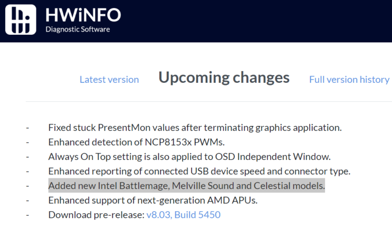 HWiNFO recevra des mises à jour pour prendre en charge les prochaines architectures de GPU Intel Battlemage, Celestial et Melville Sound. Ces mises à jour permettront de soutenir les nouvelles gammes de GPU destinées au jeu, aux data centers, ainsi que la série destinée au jeu qui devrait arriver sur le marché d’ici la fin de l’année.