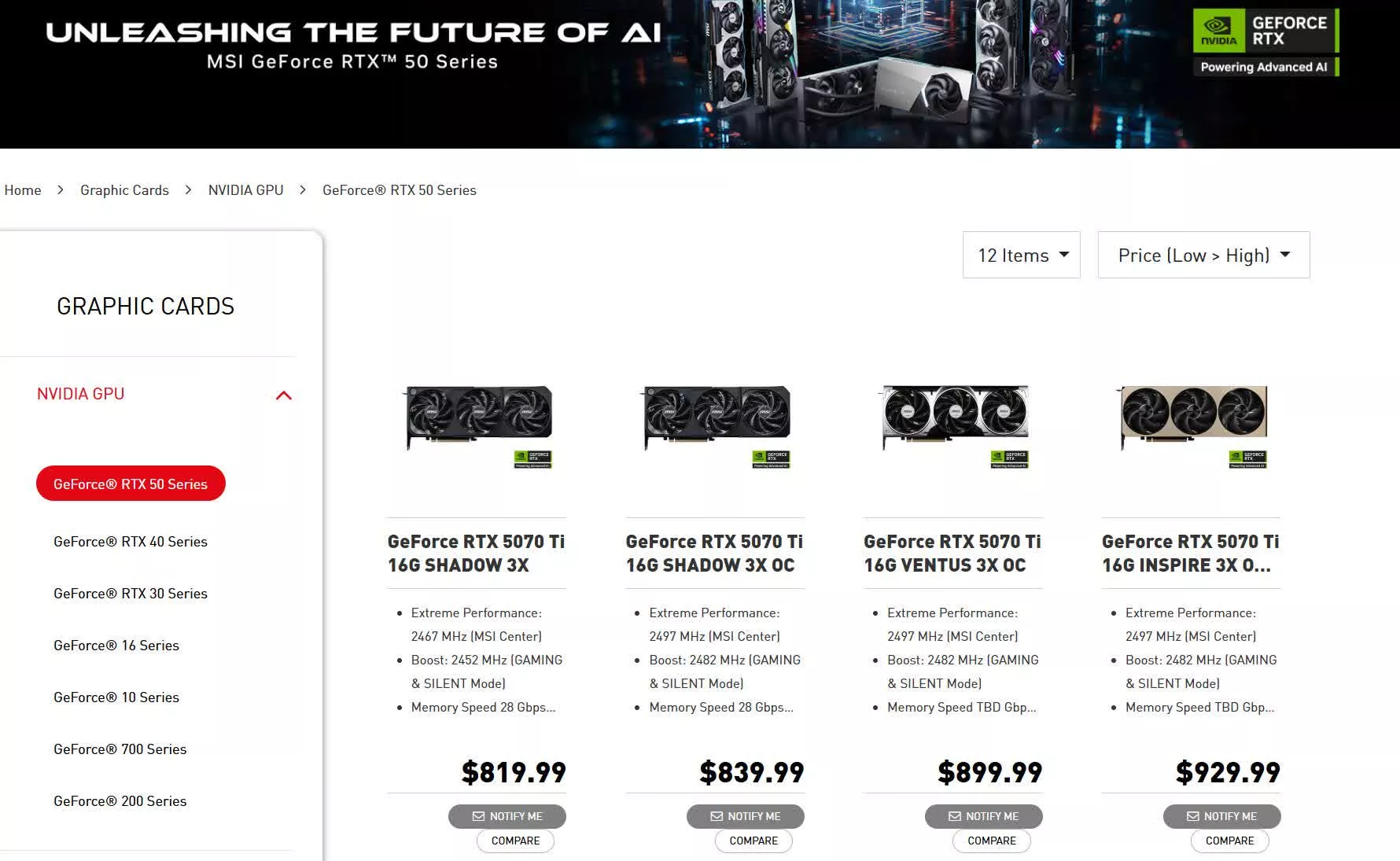 Une capture d’écran de VideoCardz montre que MSI avait brièvement augmenté les prix de ses déclinaisons les moins chères du RTX 5070 Ti, affichant le Shadow 3X à 819€ et le Shadow 3X OC à 839€ – les deux ayant depuis retrouvé le prix conseillé de 749€. Le Ventus 3X OC et le Inspire 3X OC ont également connu des augmentations temporaires de prix de 70€ et 80€, respectivement.