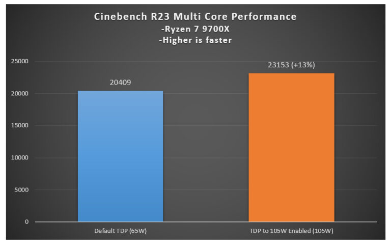 Des tests récents effectués par Kuroberu sur la carte mère MPG Carbon X670E d’MSI ont révélé des augmentations significatives des performances. En effet, le processeur Ryzen 7 9700X, avec un TDP de base de 65W, a vu sa performance s’envoler grâce à ce réglage. Les résultats obtenus ont notamment montré une amélioration du score multi-core dans Cinebench R23, qui est passé de 20 409 à 23 153, soit une augmentation de 13%.