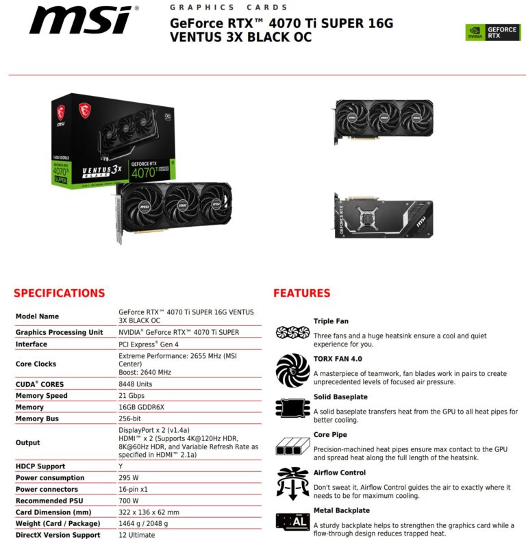 La fiche technique de MSI montre la RTX 4070 Ti SUPER Ventus 3X Black OC avec AD102 GPU