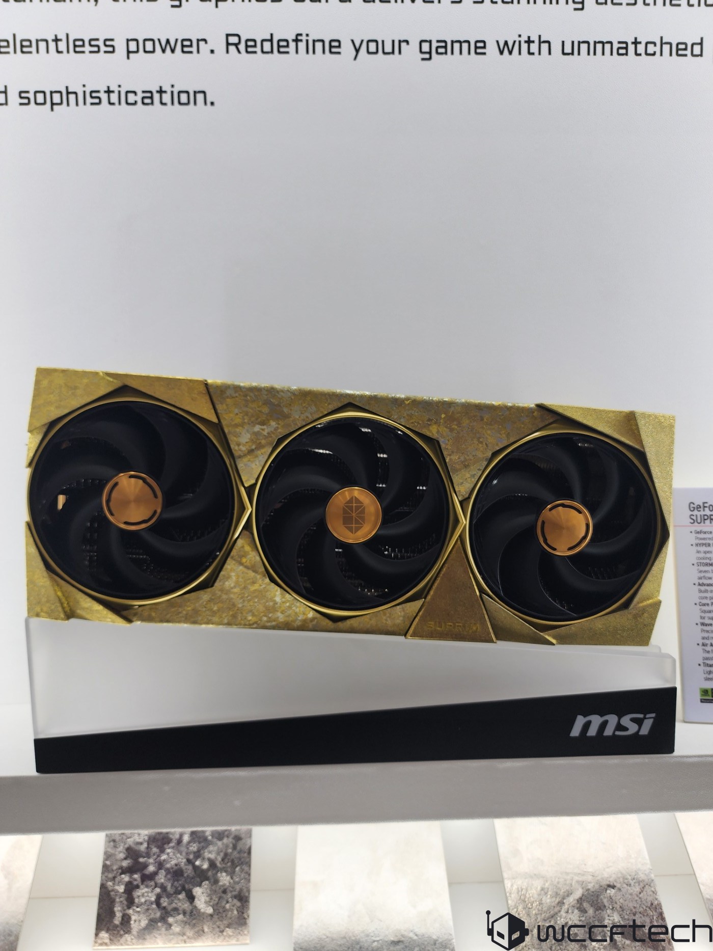 La carte graphique MSI GeForce RTX 5090 SUPRIM Titanium SOC est un véritable bijou visuel, intégrant des textures en titane doré dans un design haut de gamme. Cela lui confère une allure extrêmement premium.