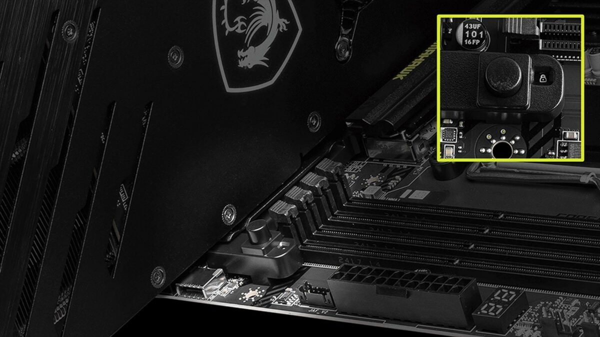 De plus, MSI a également renforcé le slot principal pour supporter le poids de ces énormes refroidisseurs. Enfin, entre ces slots, vous trouverez trois connexions M.2 pour les SSD, dont l’une offre des vitesses Gen 5 allant potentiellement jusqu’à 14 Go/s. Sans oublier le EZ M.2 Clip II qui permet le retrait des dissipateurs thermiques M.2 d’un simple geste.