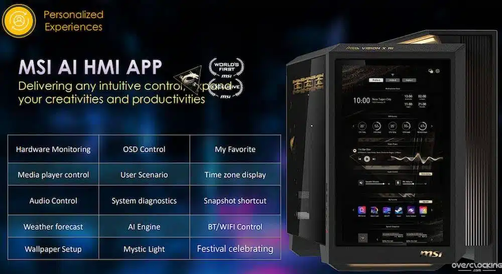 L’un des éléments les plus frappants de ce PC sera le grand panneau tactile à l’avant, désigné comme l’interface homme-machine (HMI). Ce panneau permet d’interagir avec l’IA afin de synchroniser plusieurs jeux, applications et fonctionnalités multimédias. Il servira également de moniteur pour le hardware, comme un affichage OSD.