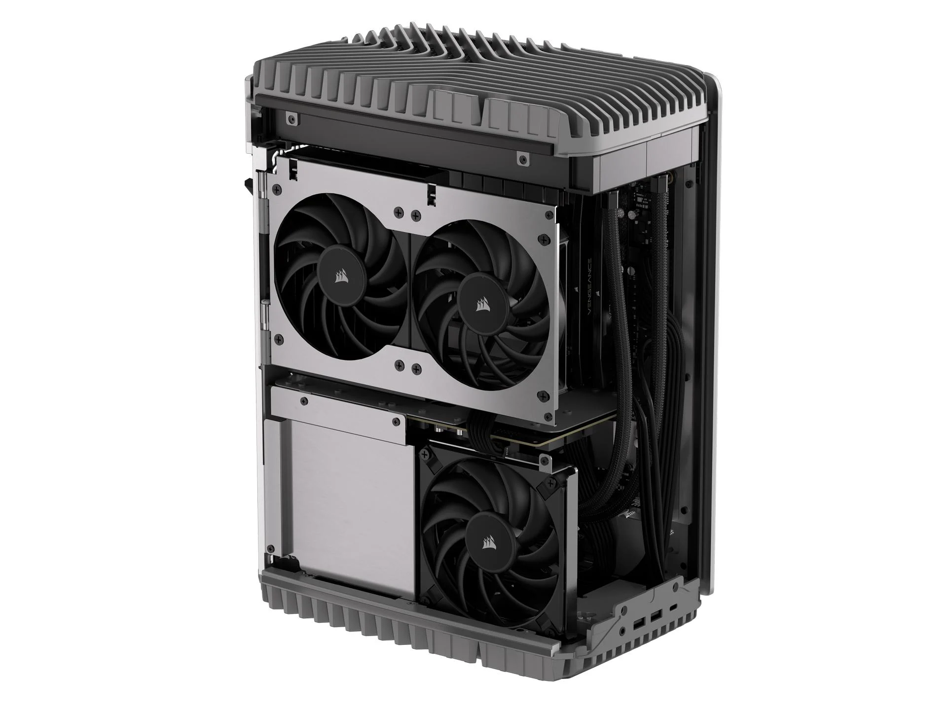 Le châssis est également équipé de cinq ventilateurs, trois fonctionnant comme prises d’air latérales et deux comme échappements supérieurs. Sans oublier une alimentation SFX 80 Plus Gold de 1 000 W pour alimenter tout. Les prises d’air latérales sont révélées pour un nettoyage et un entretien faciles, et le dessus est amovible pour un nettoyage approfondi.
