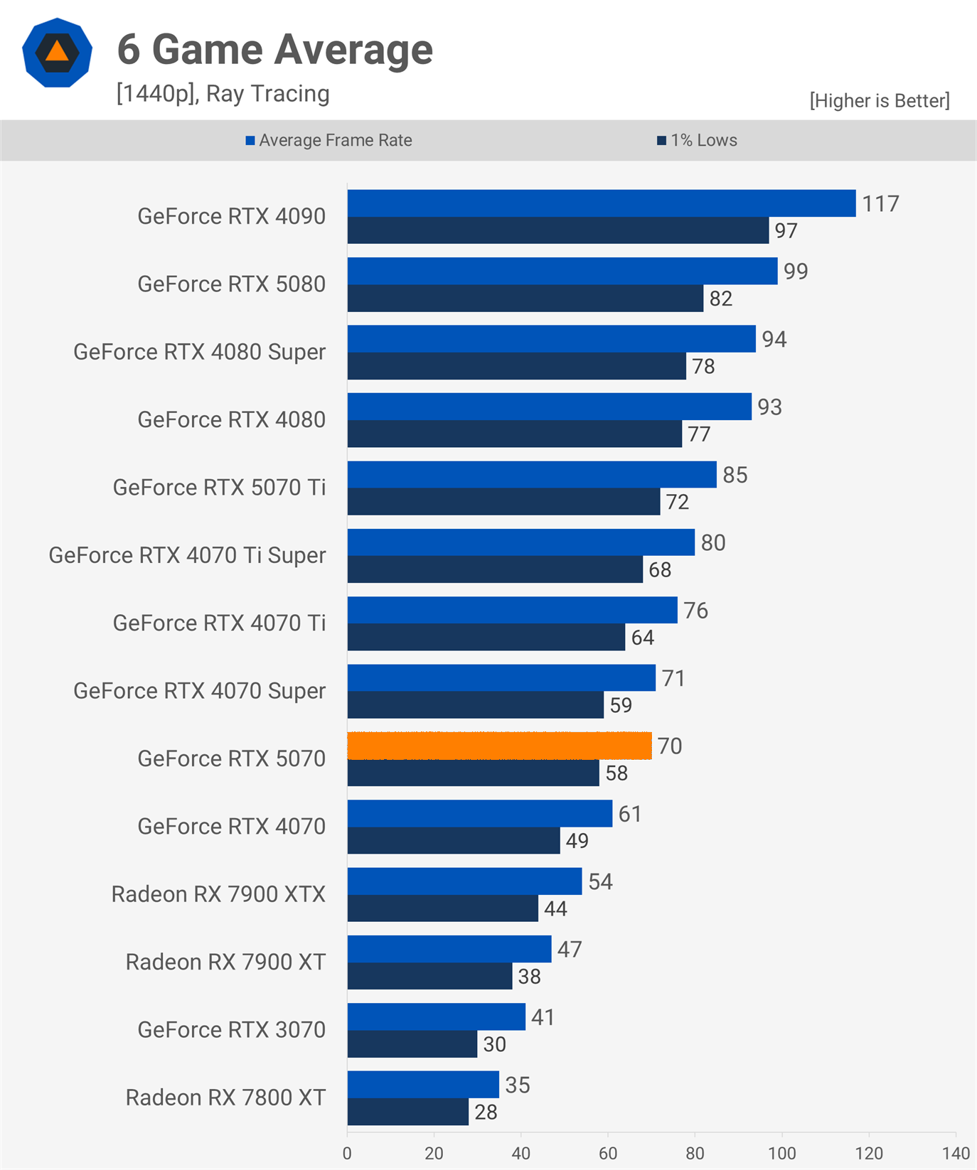 Les tests ont sévèrement critiqué NVIDIA pour avoir affirmé que la RTX 5070 au prix de 549€ offrirait des performances comparables à celles de la RTX 4090 à 1,600€. Cette affirmation ne concernait en réalité que l’utilisation de la génération d’image multi-image de la carte Blackwell. Notre graphique moyen sur six jeux (1440p, ray tracing) a montré que même la RTX 4070 Super surpassait la RTX 5070, tandis que la RTX 4070 Ti restait en tête dans les résultats de ray tracing 4K. Nous avons attribué à la carte un score de 60, notant qu’il s’agit essentiellement d’une version actualisée de la RTX 4070 Super avec 50€ de moins sur le prix conseillé.