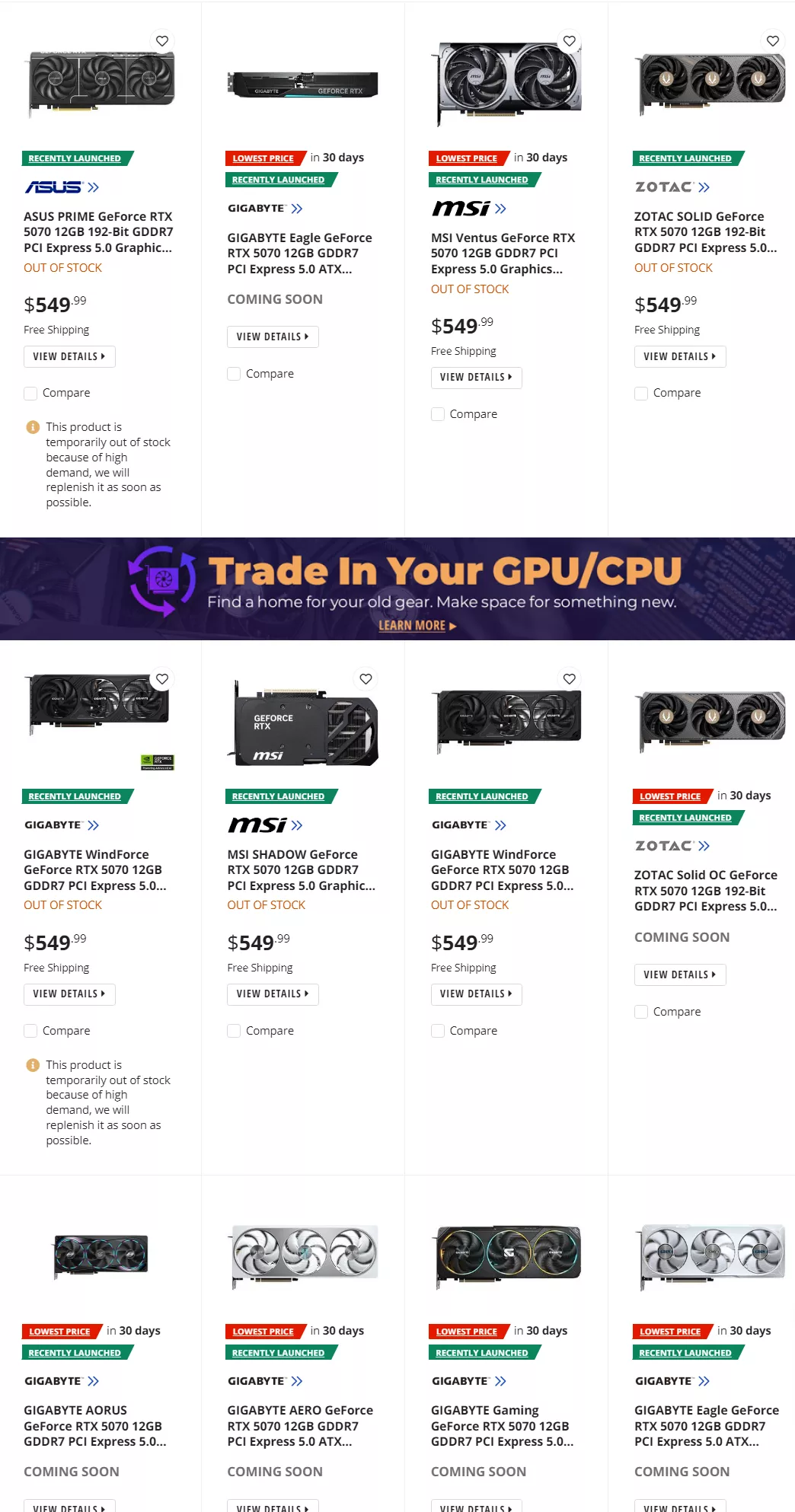 Les cartes RTX 5070 de tiers seront lancées aujourd’hui à 6h PT / 9h EST. Newegg ne liste maintenant que des cartes avec le prix conseillé, et même celles-ci sont indiquées comme étant épuisées.