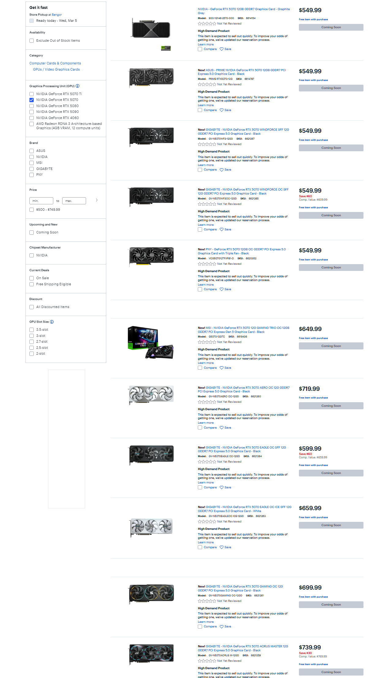 Best Buy propose également plusieurs cartes RTX 5070 de tiers au prix conseillé, ainsi que quelques modèles plus chers, dont deux affichés à 740€. Le site de ventes mentionne également une RTX 5070 FE, bien qu’il soit probable qu’elle reste indiquée comme ‘À venir’ jusqu’à la fin du mois.