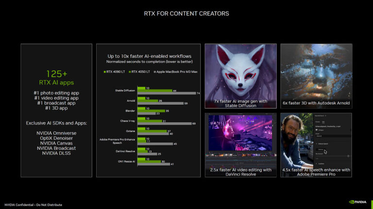 Outre le support évident de l’accélération de l’IA pour les GPU NVIDIA à travers PyTorch, ONNX et TensorFlow, NVIDIA a plusieurs technologies soit disponibles soit à venir dans les jeux à l’avenir, telles que DLSS, RTX Remix et NVIDIA ACE. Ce dernier est probablement le concept le plus intéressant, permettant aux développeurs de jeux de créer des personnages virtuels capables de parler aux joueurs en fonction de variables prédéfinies.