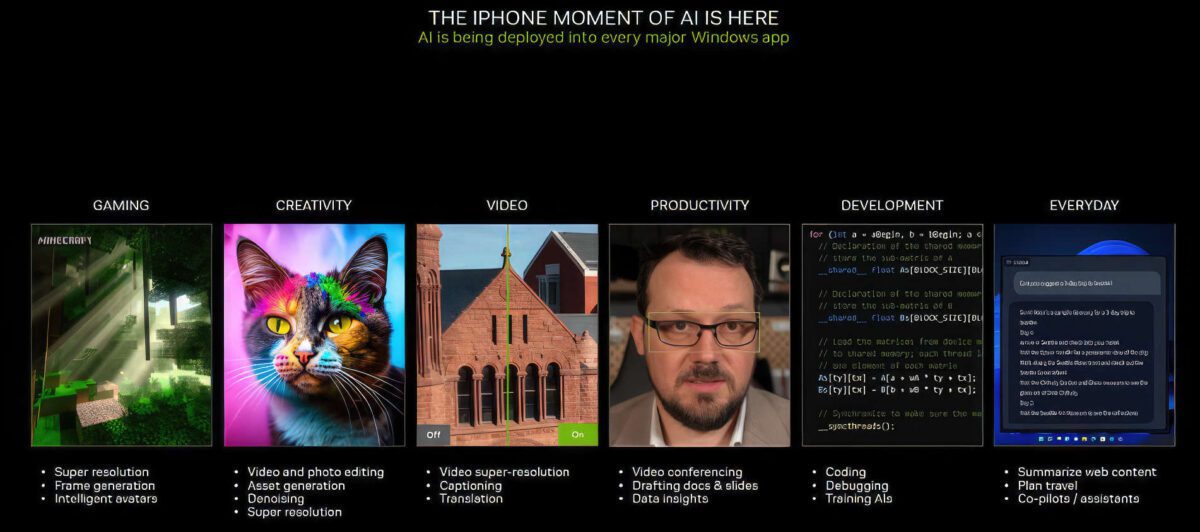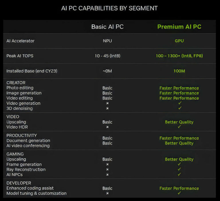 NVIDIA met en avant l’idée d’ordinateurs AI Premium équipés par les GPU GeForce. En 2024, NVIDIA insiste sur le fait que l’IA a toujours été le domaine des processeurs graphiques, pas des NPU, offrant des performances supérieures. Ils mettent en avant l’idée d’un PC AI de base équipé par un NPU et d’un PC AI Premium équipé par un GPU, avec ce dernier offrant de 100 à 1300 TOPS. Selon NVIDIA, la base installée de PC AI Premium est déjà de 100 millions d’unités, tandis que les systèmes basés sur les NPU n’ont même pas atteint 1 million de ventes d’ici fin 2023.