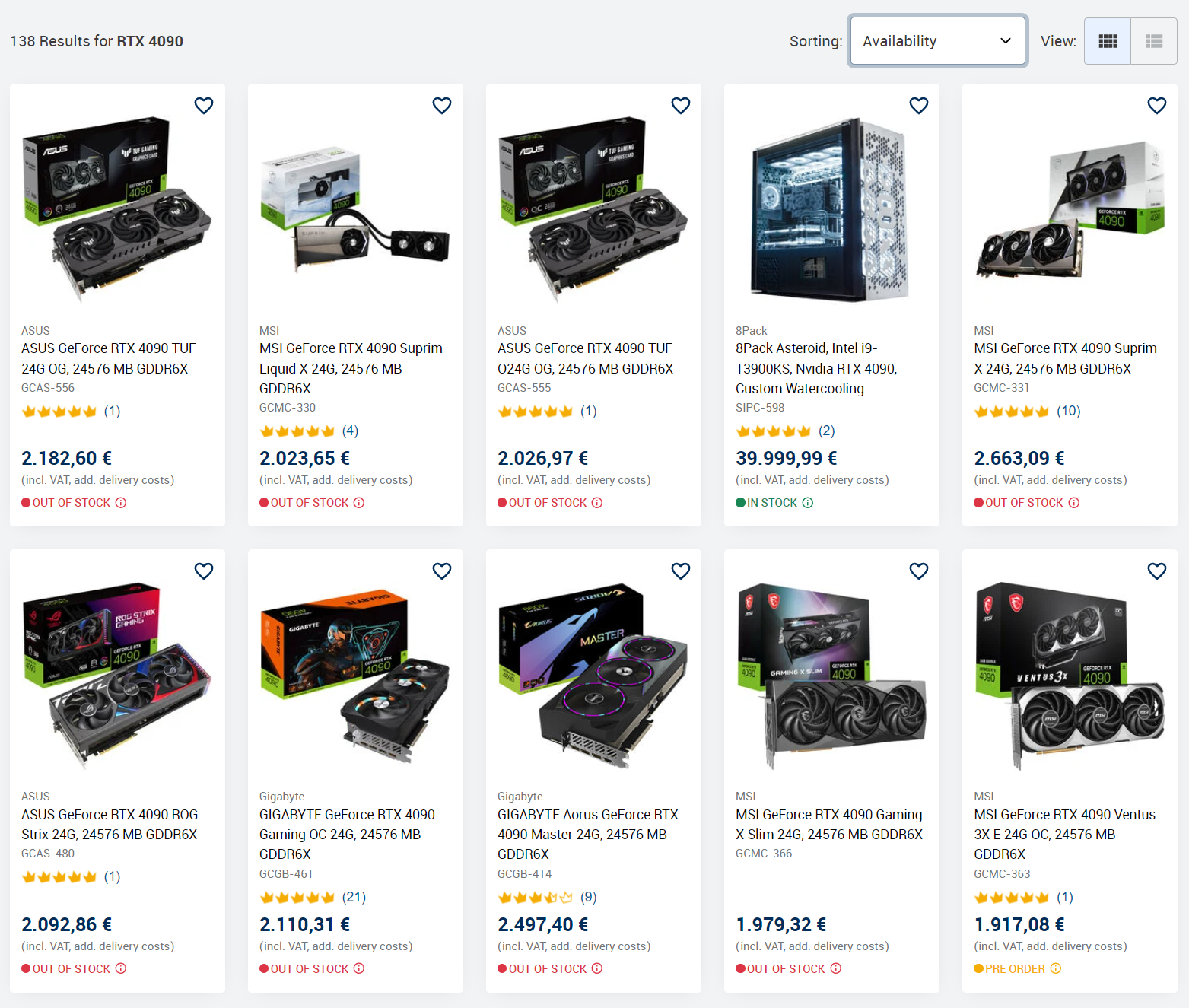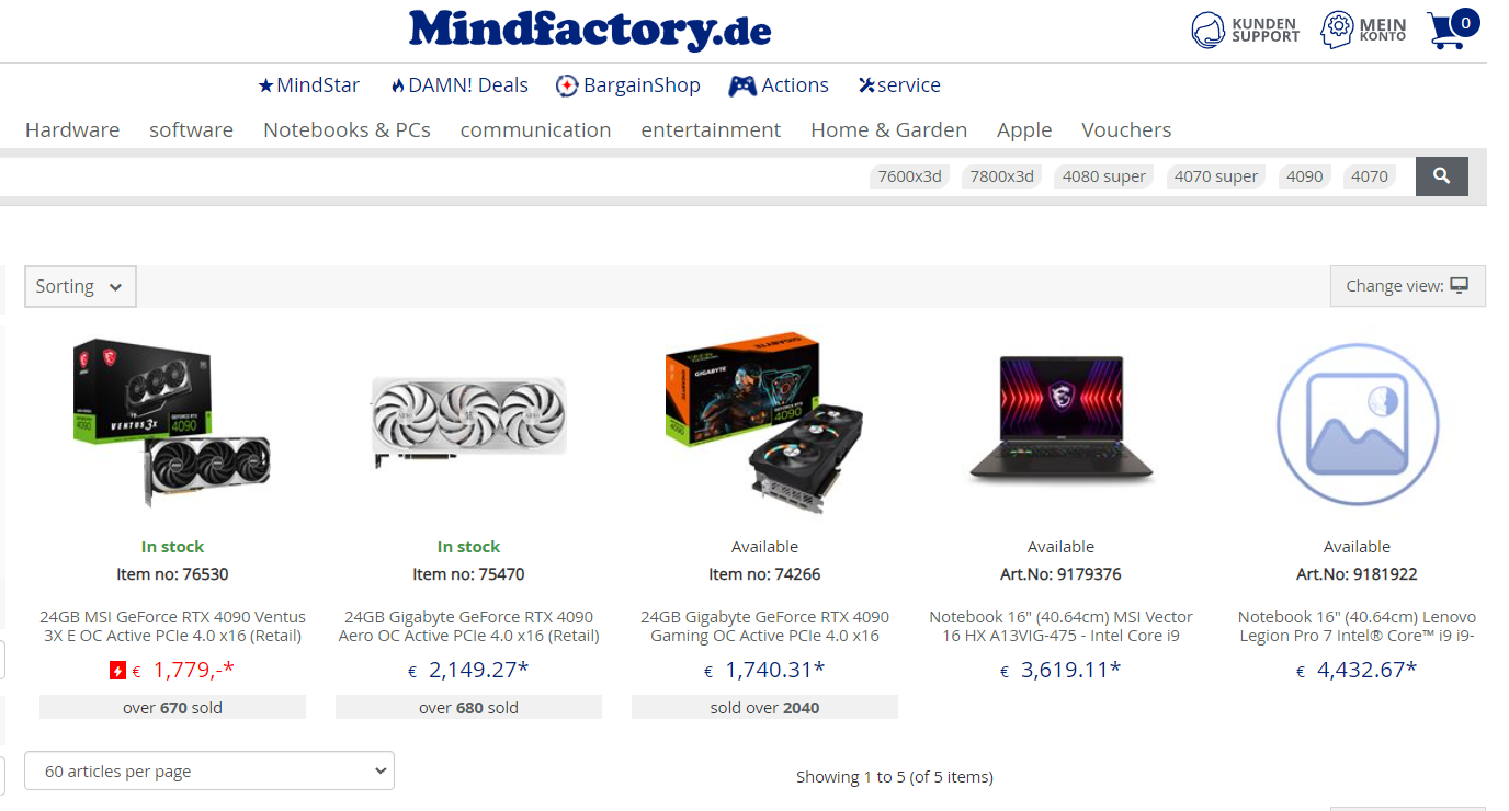 Actuellement, les principales plateformes de vente en ligne ne proposent plus la GeForce RTX 4090. Sur des sites comme Caseking et Mindfactory, les pages de produits sont soit complètement absentes, soit affichent des unités de précommande. Tandis que quelques modèles subsistent, leur disponibilité reste plus que limitée.