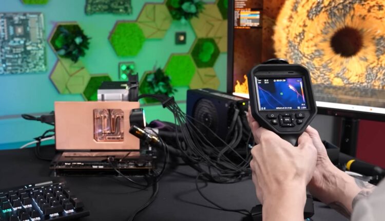 En examinant le câble et ses broches, des indices ont commencé à émerger. Cependant, c’est grâce à une caméra thermique que der8auer a découvert le potentiel problème. Sous une charge de 575W, deux des douze threads alimentant la carte étaient anormalement chauds, atteignant une température alarmante de 150°C au niveau de la connexion avec l’alimentation après seulement quatre minutes.