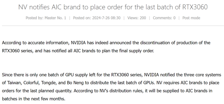 Selon des rapports de Board Channels, qui rassemblent des informations des principaux partenaires constructeurs de cartes, NVIDIA a informé ces derniers qu’il s’agit de la dernière occasion de passer des commandes pour la série RTX 3060. Des entreprises comme Colorful et Palit ont été averties qu’elles peuvent effectuer leurs commandes finales pour ce modèle.