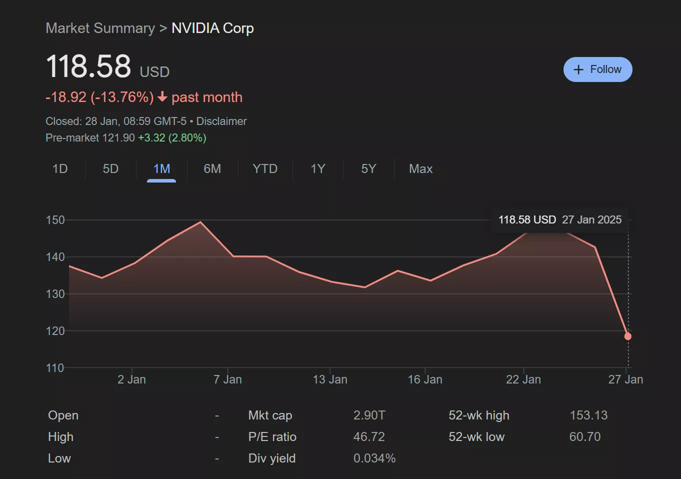 Le cours de l’action d’NVIDIA s’est effondré à 118,58 € hier, effaçant 593 milliards € de sa valeur et marquant le pire jour de la société sur le marché depuis le début de la pandémie – le 16 mars 2020. Cette perte a fait chuter NVIDIA de sa position de plus grande entreprise au monde par capitalisation boursière, sa valorisation passant de 3,5 trillions € à 2,9 trillions €, la rendant moins précieuse qu’Apple et Microsoft.