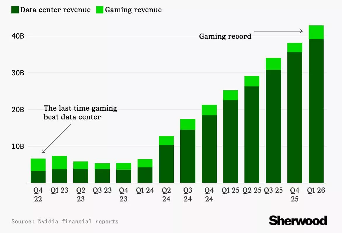 Fait intéressant, les revenus du jeu de NVIDIA ont connu leur taux de croissance le plus rapide depuis des années, avec une augmentation de 42% d’une année sur l’autre et de 48% par rapport au trimestre précédent, dépassant les attentes de Wall Street de plus de 30%. Cependant, cela ne représente que 8,5% des revenus totaux de NVIDIA.