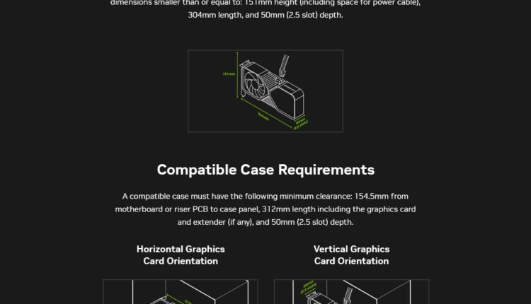 En revanche, les boîtiers doivent être un peu plus grands que ces dimensions pour permettre le dégagement. NVIDIA exige la même profondeur de 50 mm avec une longueur de 312 mm et 154,5 mm d’espace entre la carte mère ou le PCB de l’adaptateur et le panneau du boîtier. Quelques exemples incluent Fractal Design Terra, Corsair 2000D, et Lian Li A4-H20. Vous pouvez voir une liste de boîtiers et de cartes graphiques compatibles ici.