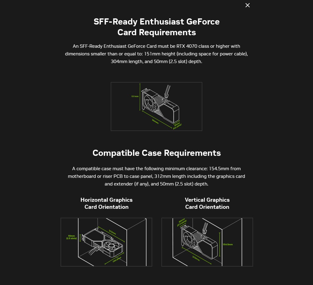 Pour obtenir le titre de SFF-Ready, les cartes graphiques ne doivent pas dépasser 304 mm de longueur, 50 mm de profondeur pour occuper au maximum 2,5 slots, et 151 mm de hauteur avec de la place pour le câble d’alimentation.
