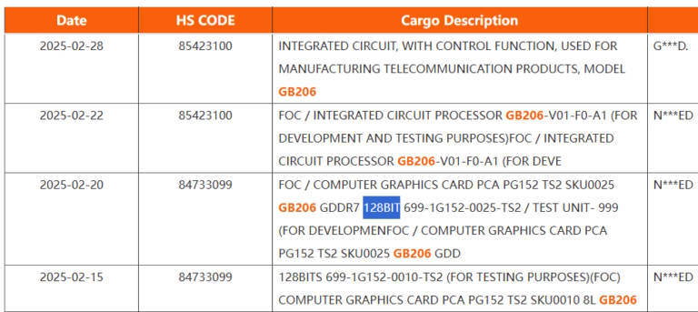 Il semble que NVIDIA ait effectivement retenu le bus mémoire de 128 bits pour ses cartes graphiques d’entrée de gamme à venir. Des manifestes d’expédition ont révélé des identifiants comme « PG152 SKU 25 » et « PG152 SKU 10 », qui sont supposés correspondre aux modèles GeForce RTX 5060 et GeForce RTX 5060 Ti. La description des manifestes les relie à un bus mémoire de 128 bits.