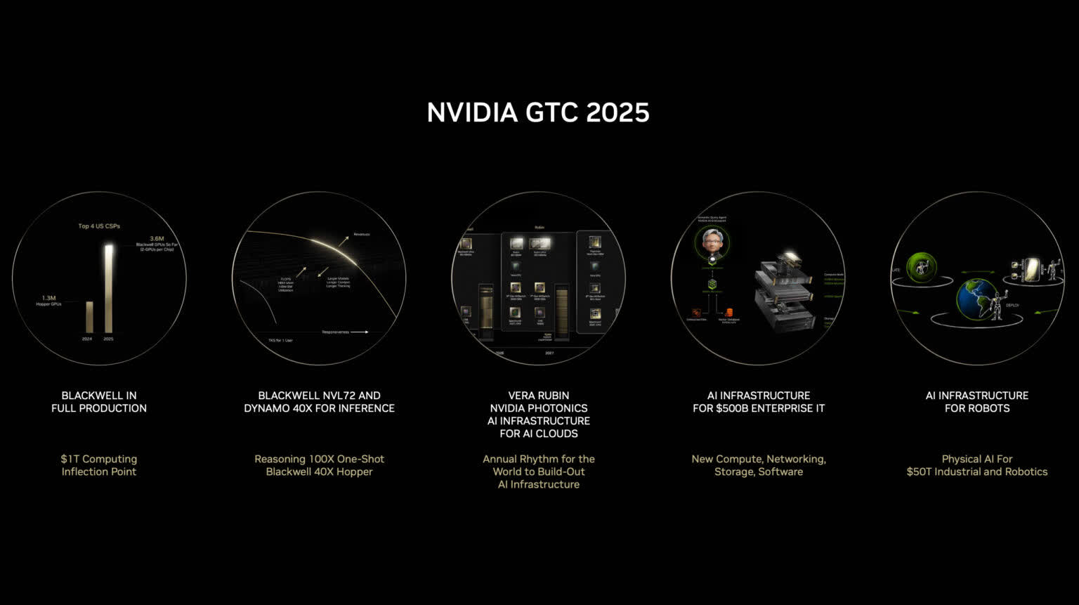 Il a également dévoilé la nouvelle architecture Vera Rubin, présentant un nouveau CPU basé sur Arm appelé Vera et un GPU de nouvelle génération nommé Rubin, chacun intégrant significativement plus de cœurs et de capacités avancées. Huang a même fait allusion à la génération suivante, nommée après le mathématicien Richard Feynman, projetant la roadmap de NVIDIA jusqu’en 2028 et au-delà.