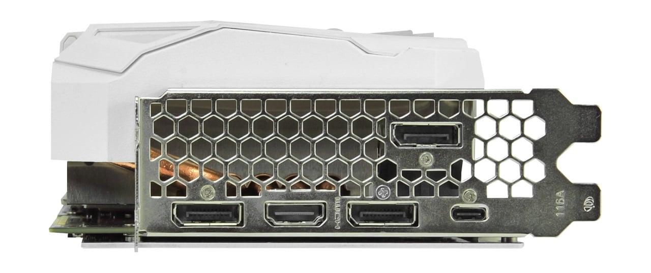 Concernant les sortie d’affichage, cette carte possède trois ports DisplayPort 1.4a et un port HDMI 2.0b. Un port USB de type C vient aussi faire son apparition, celui-ci est en train de devenir LE nouveau standard pratique. Côté alimentation ce sont 2 x PCIe 8 broches qui s’en charge, Palit recommande une alimentation minimum de 650 Watts.